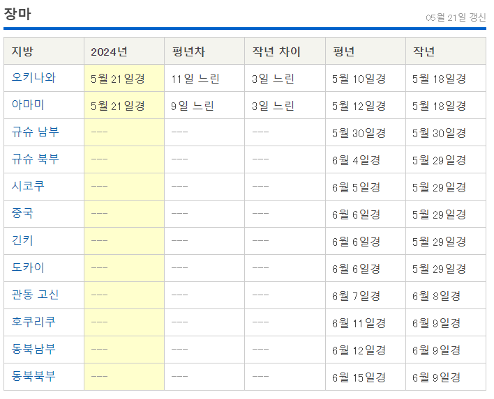 오키나와는 이미 5/20경 장마가 시작되었다고 알려져 있습니다.