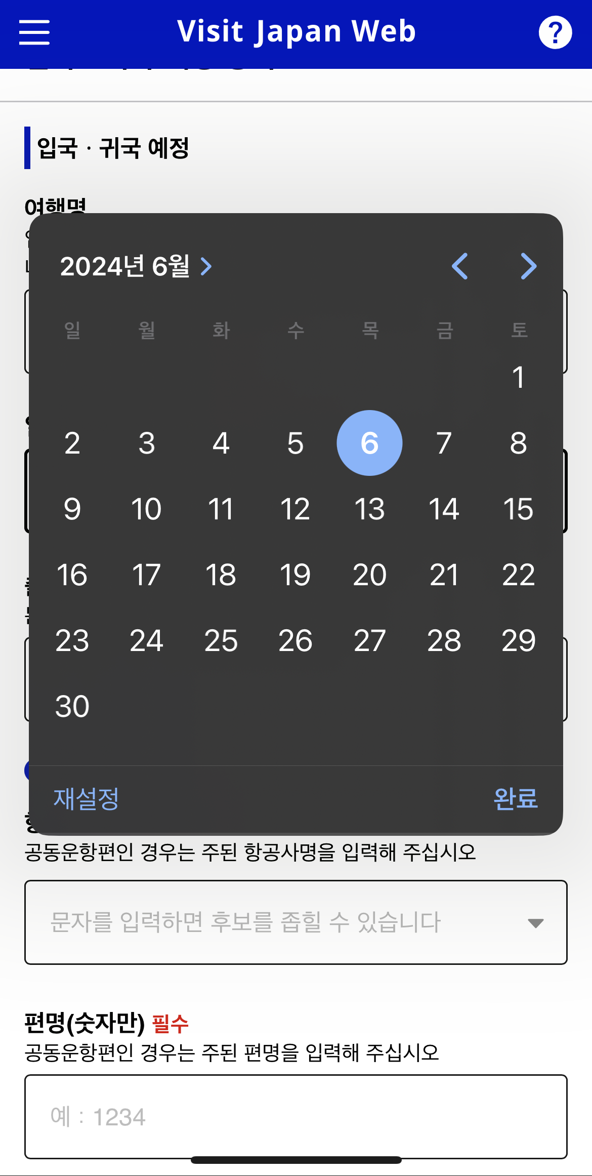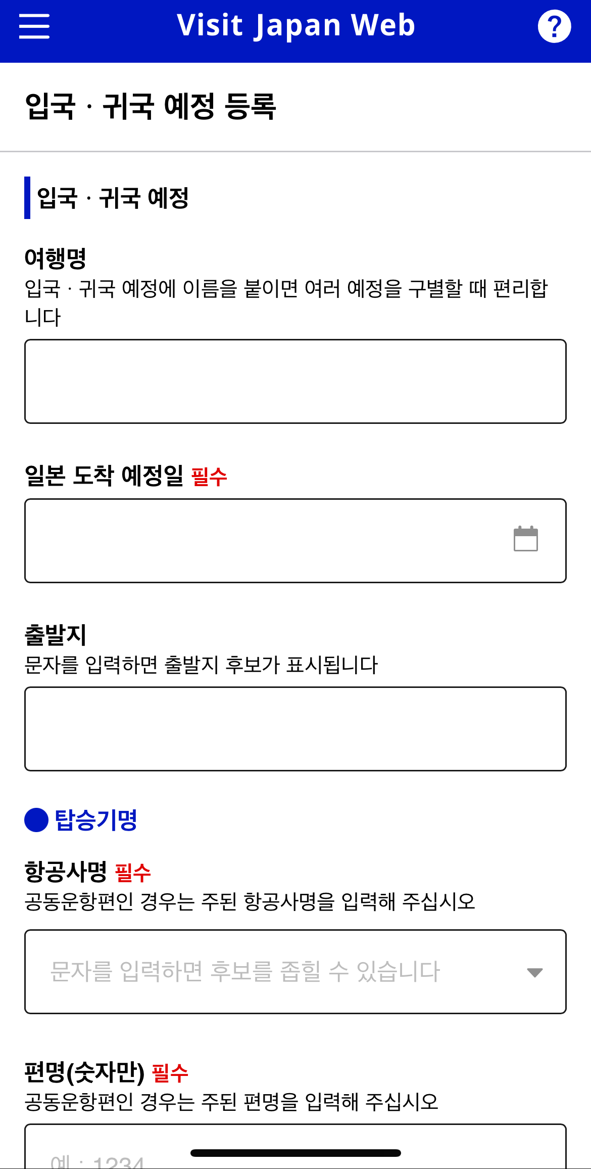 도착일, 출발지, 항공사명, 항공편명 입력!