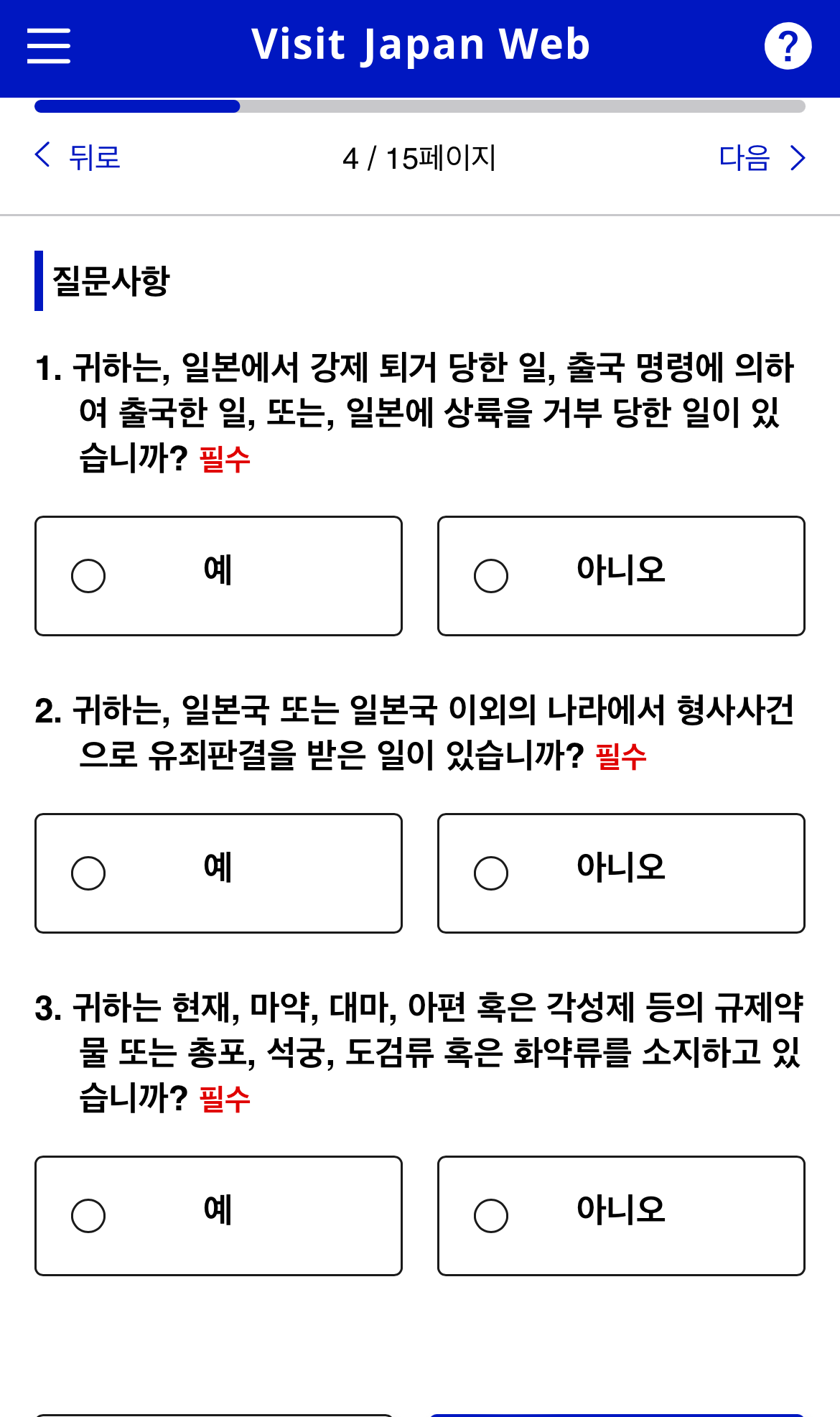 기본정보를 입력하고 나면 질문사항이 여러가지 나옵니다.