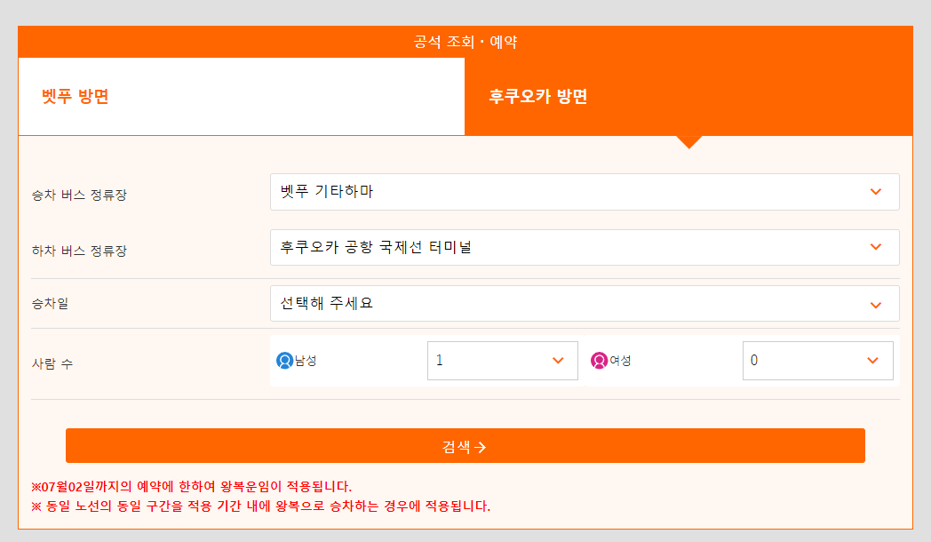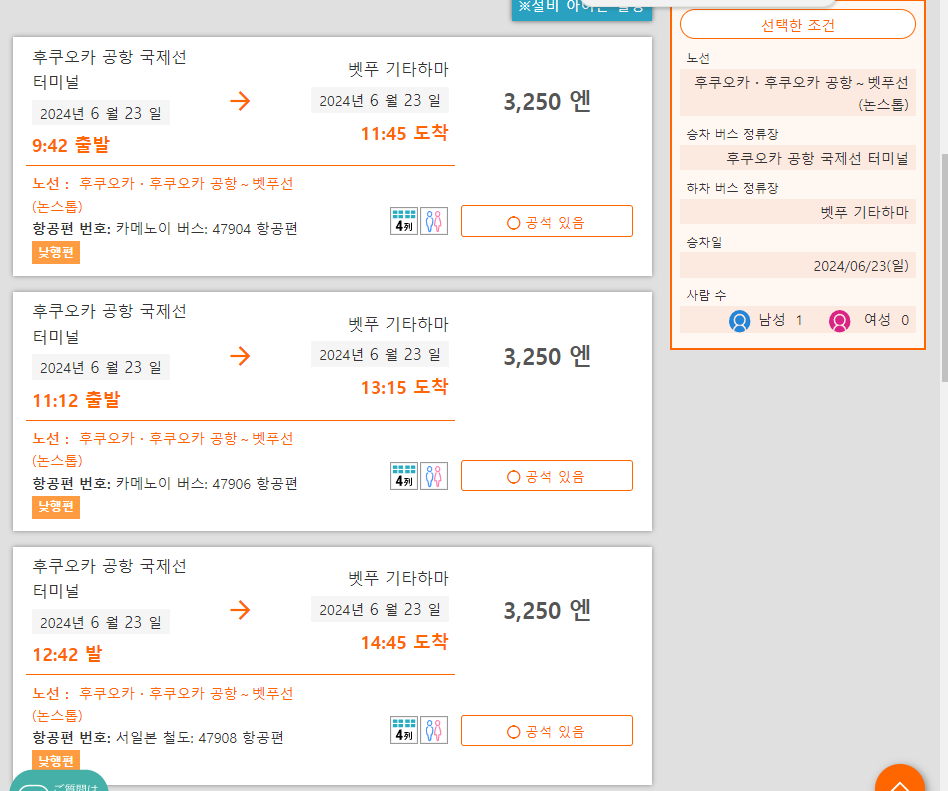후쿠오카 공항에서 벳푸 키타하마까지 갈 경우 다음과 같이 입력하면 됩니다.