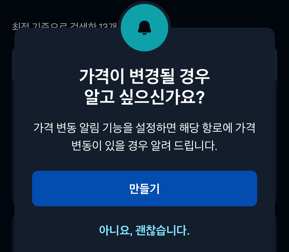 이 기능은 내가 원하는 항공권의 가격이 내려갔을 때 알림을 주는 기능이라
