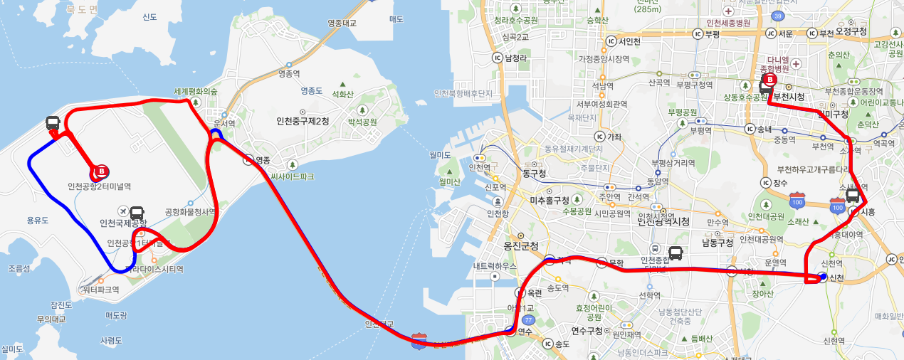 🚌 부천터미널 소풍 - 부천소방서 - 소사역 지하차도 - 소새울역.한울빛도서관.복사초등학교 - 시흥ABC행복학습타운 - 인천공항 1터미널 - 인천공항 2터미널