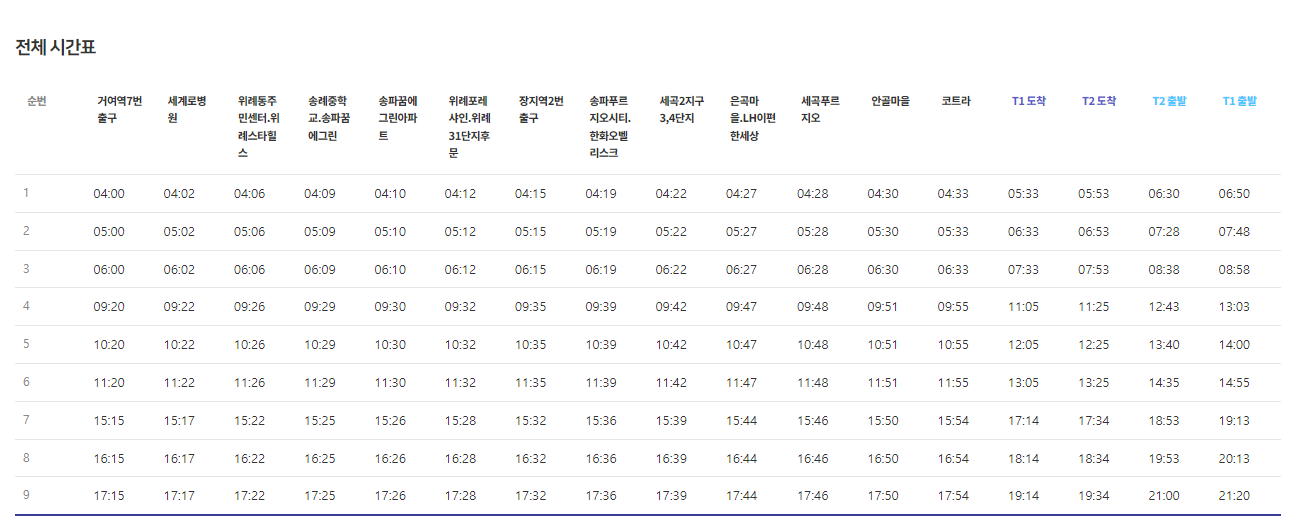 ⏩ 거여역 7번출구 - 세계로병원 - 위례동주민센터.위례스타힐스 - 송례중학교.송파꿈에그린 - 송파꿈에그린아파트 - 위례포레샤인.위례31단지후문 - 장지역2번출구 - 송파푸르지오시티.한화오벨리스크 - 세곡2지구3,4단지 - 은곡마을.LH이편한세상 - 세곡푸르지오 - 안골마을 - 코트라 - 인천공항 1터미널 - 인천공항 2터미널