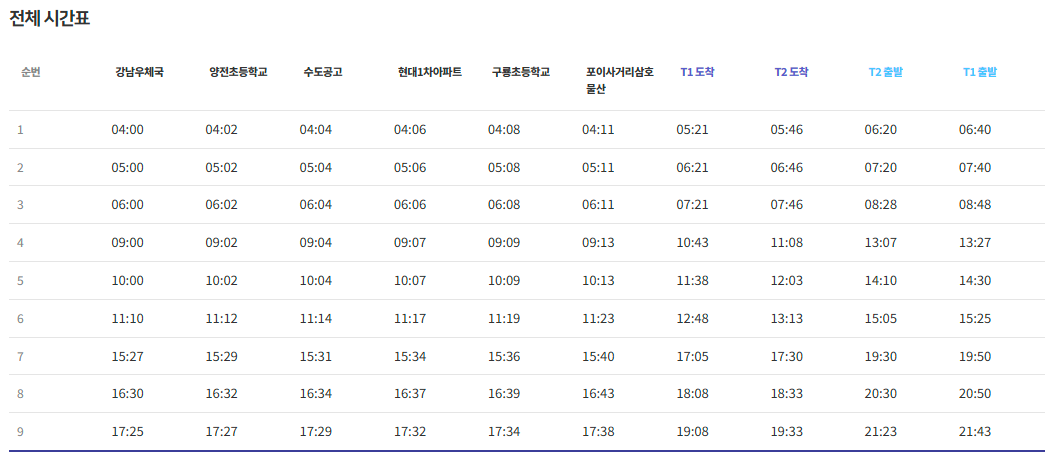 ⏩ 강남우체국 - 양전초등학교 - 수도공고 - 현대1차아파트 - 구룡초등학교 - 포이사거리 삼호물산 - 인천공항 1터미널 - 인천공항 2터미널